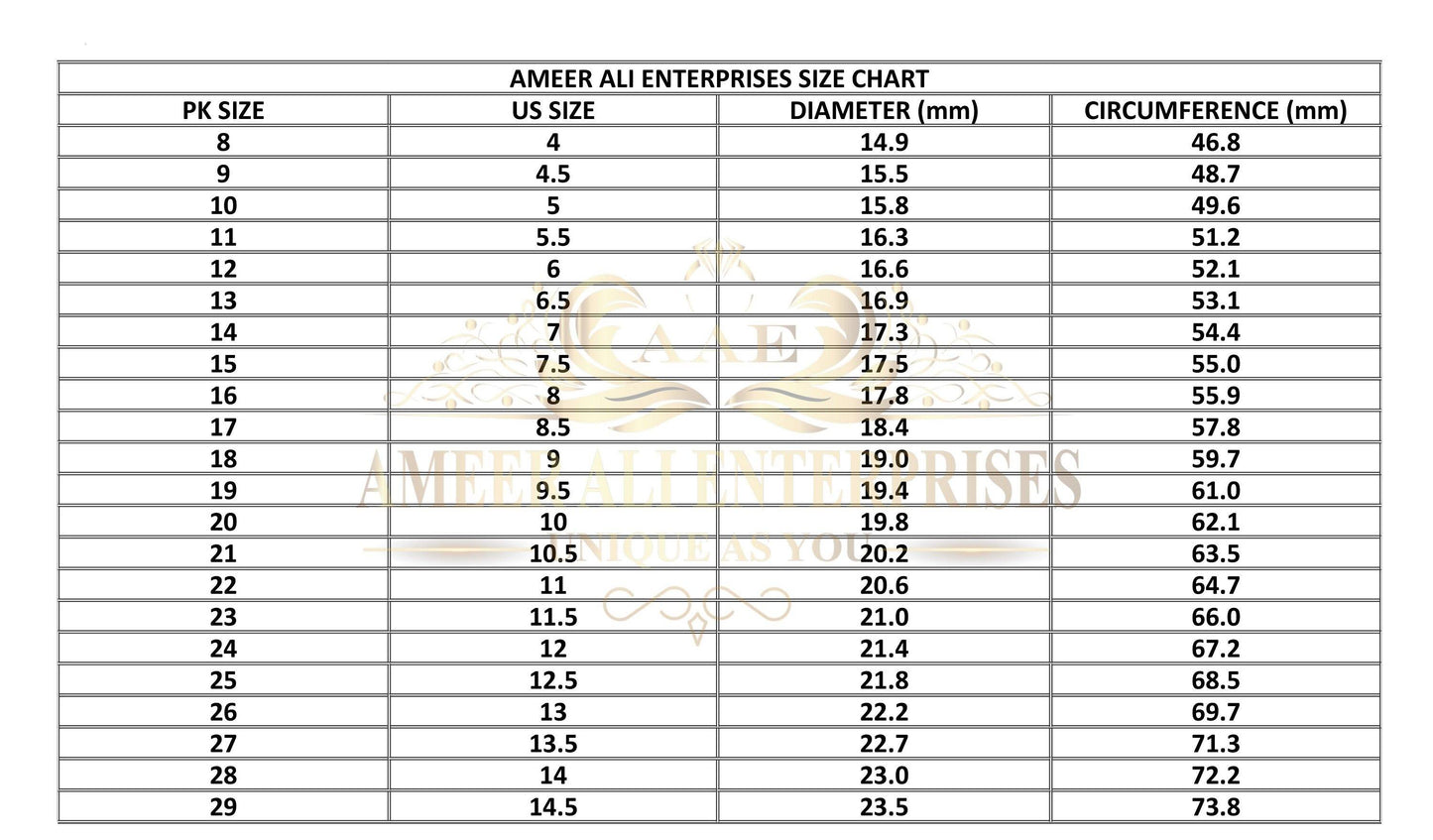 After measuring, Pick the closest measurement on the ring size chart to find your ring size.